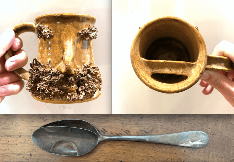 Are you a gentleman with a fine, bushy moustache perched over your lip? Then you’re gonna need this handy 1970’s vintage “Moustache Mug” to keep your hairy facial adornment dry while you drink your whole cup of coffee. AND, this silver-plated “Moustache Spoon” by the venerable and perfectly respectable silverplate manufacturer Reed and Barton will help you sip your soup tidily.