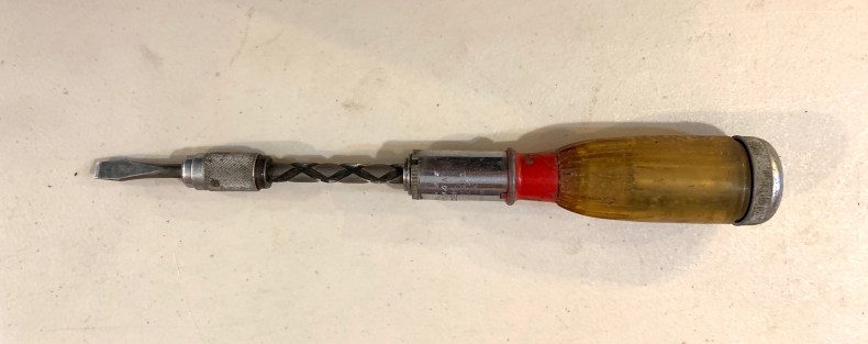 This vintage screwdriver sold at the Beehive uses the same engineering principle in reverse – it has a small ratchet inside that keeps the shaft rotating in only one direction. With each downward twist of your wrist as you screw into a piece of wood, the shaft stays immobile, allowing you to apply maximum pressure. The screw mechanism then releases on each ‘back-wind’ of the handle, independent of the bit still stuck in the screw. This means you don’t have to continually reposition the bit as you go, making the uninterrupted action of this simple manual screwdriver closer to that of an electric driver. Need to unscrew something? A handy “F/R” toggle allows you to change directions; the shaft has two opposing spirals for forward and backward. These screwdrivers were (and still are) made by many companies and given a variety of titles such as automatic push drill, reciprocating spiral drill, or Archimedean push drill.